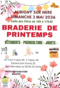 Braderie de Printemps dimanche 3 mai à Aubigny sur Nère par l’association Familles Aubigny et Cher Nord